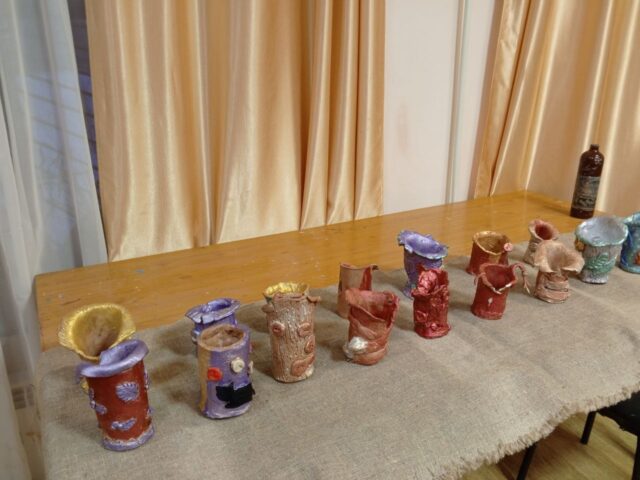 У каждого получились вазочки со своим «характером», дети с помощью педагогов и взрослых импровизировали как могли. После — раскрашивали свои чудесные поделки: синий, золотой, серебро — все еще так дышит елкой и чудом!